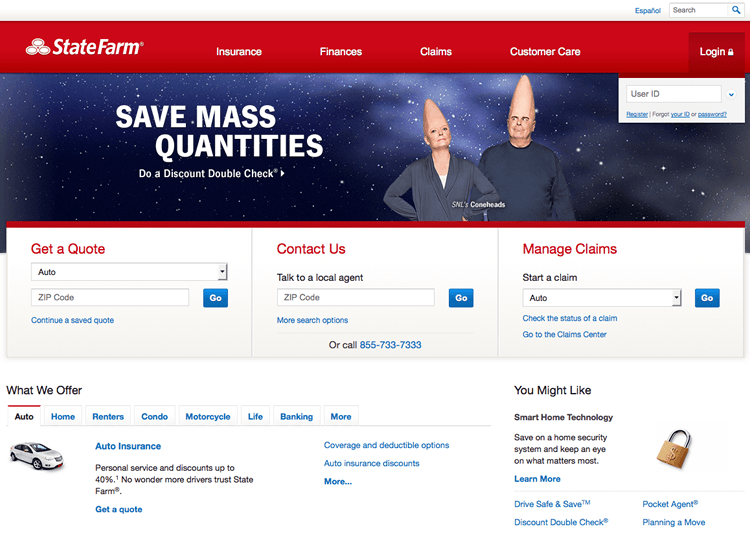 State Farm's main goal is to get leads through insurance quotes. Below is their homepage review using the process I use at the top of this article.
